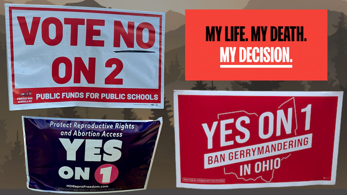 From dying with dignity, to reproductive freedom, to funneling money to private schools, y'all have some important ass measures to vote on.